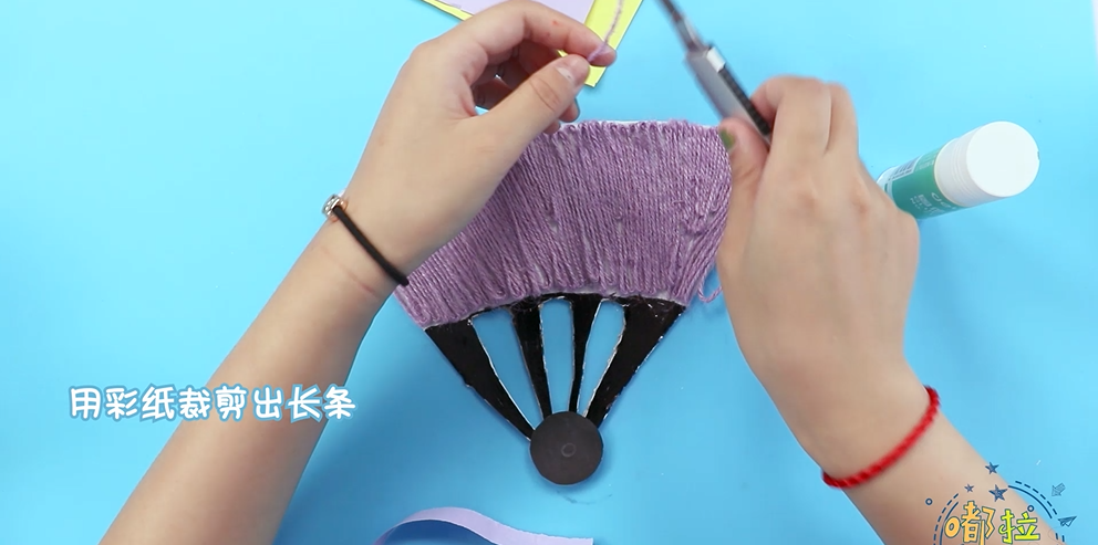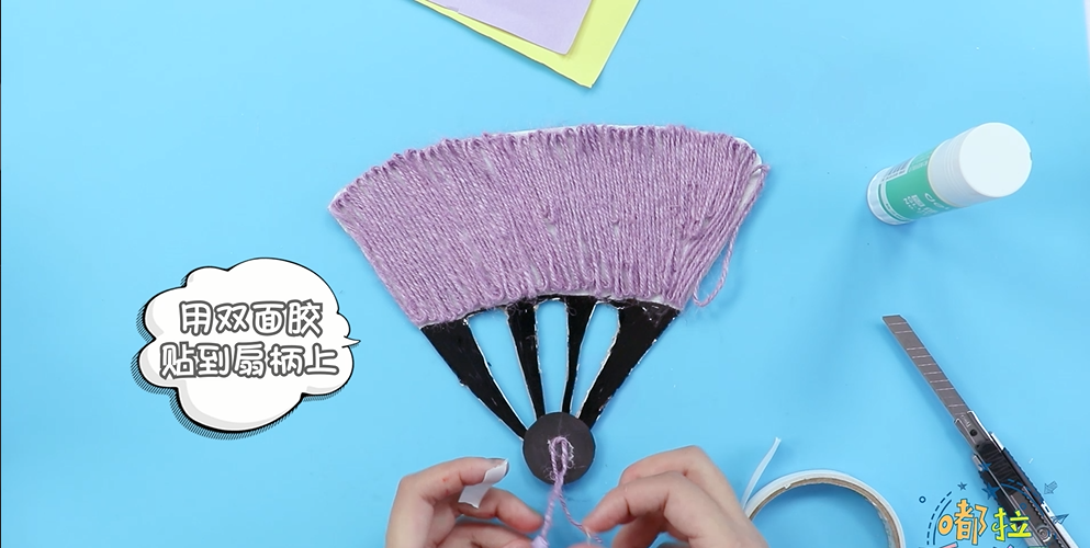 ● 用彩纸剪出长条,用双面胶贴到扇柄上。