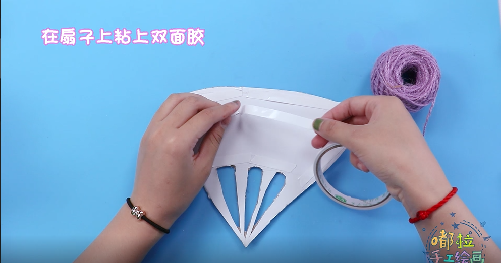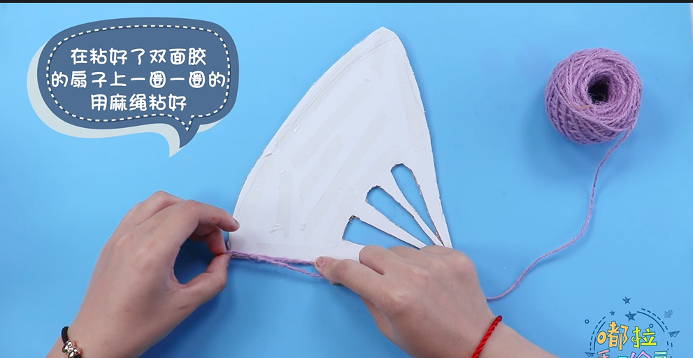 ● 在扇子上粘上双面胶,用麻绳粘满整个扇子;用黑笔上色。